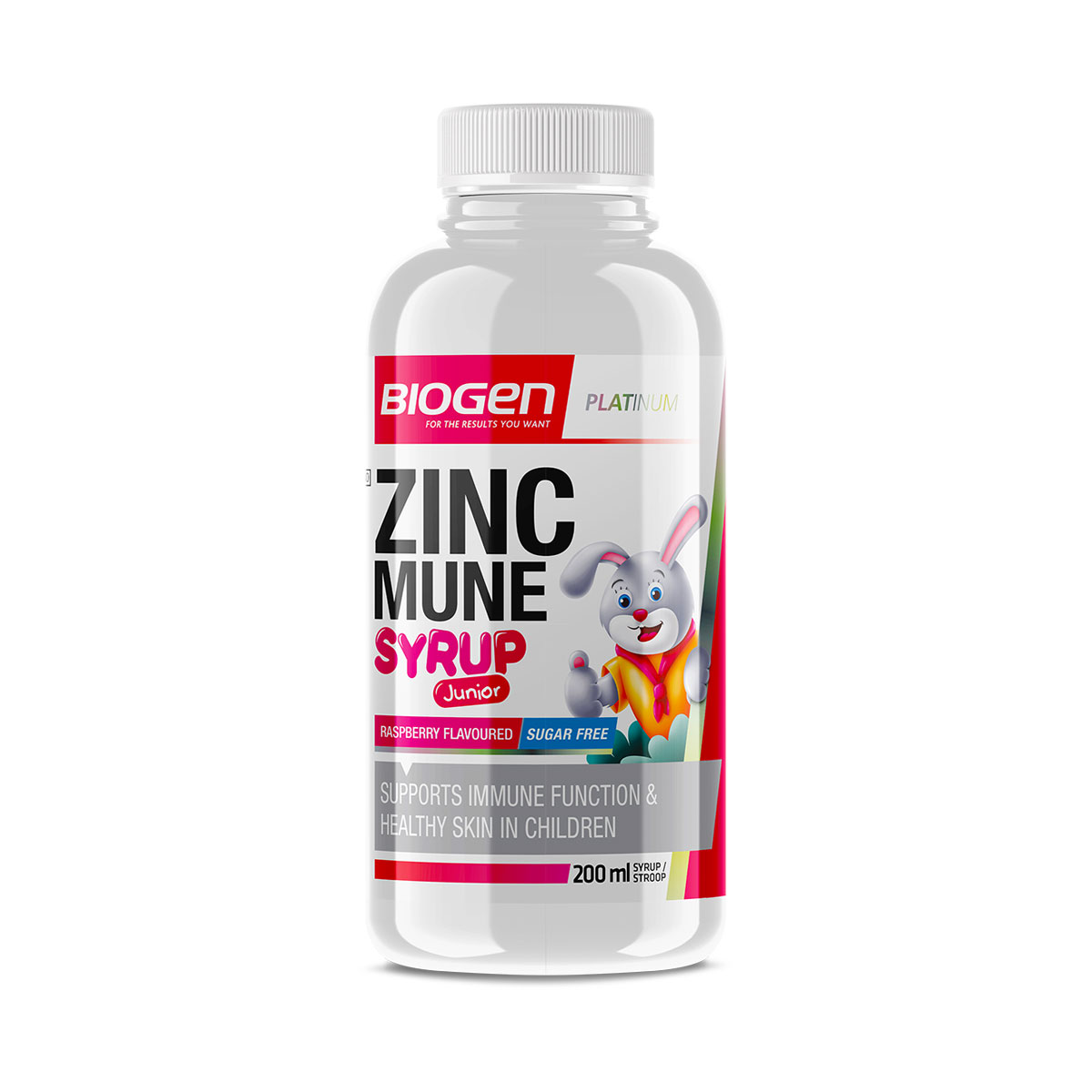 DOSAGE: (Children 3-12 months): Take 1,25 ml daily. (Children 1-3 years): Take 5 ml daily. (Children 4-8 years): Take 7,5 ml daily. (Children 9-13 years): Take 15 ml daily. Biogen Zinc Mune Syrup should be taken after meals. Shake the bottle well before use. Health supplements are intended only to complement health or supplement the diet.